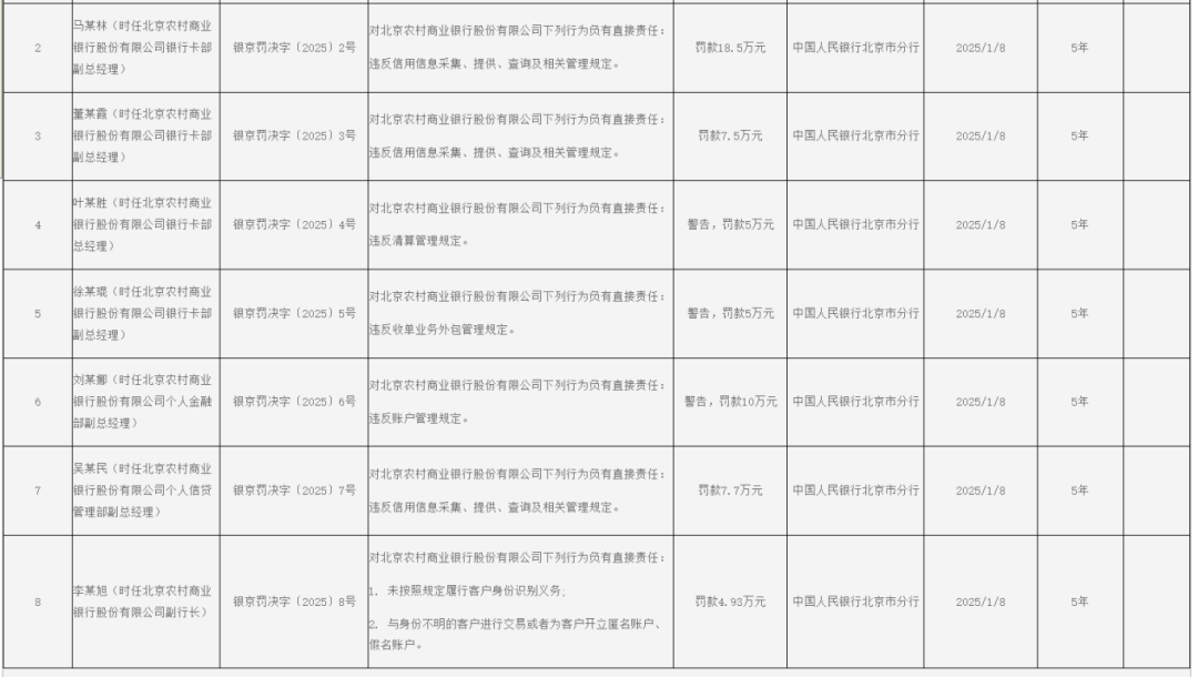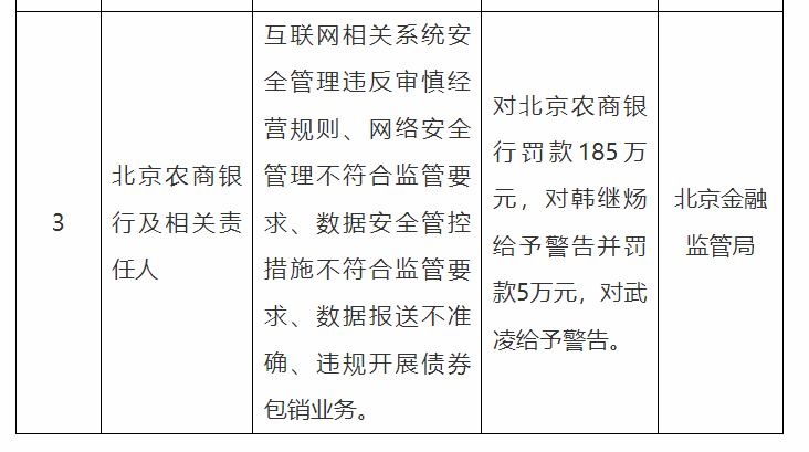 2025 年 9 月,北京农商行曾因系统安全管理违规、数据安全管控不合规等问题被罚 185 万元。对韩继炀给予警告并罚款5万元,对武凌给予警告。