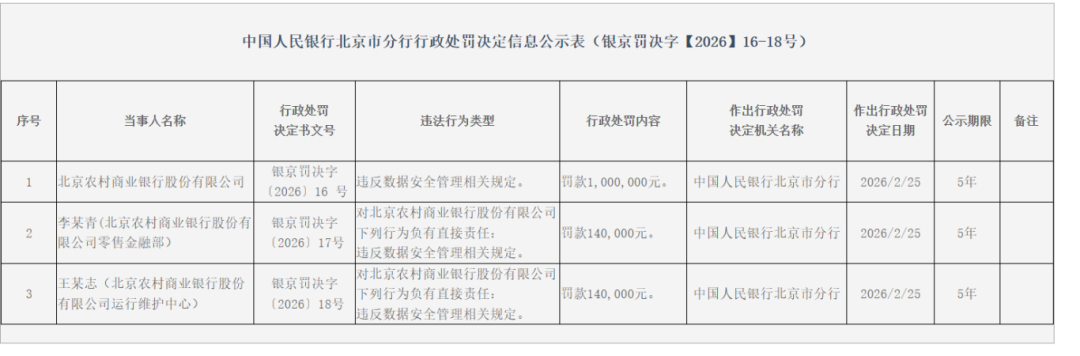2 月 28 日,央行北京市分行公布行政处罚信息,北京农村商业银行因违反数据安全管理相关规定,被罚款 100 万元。同时,零售金融部李某青、运行维护中心王某志因负直接责任,分别被罚款 14 万元,监管 “双罚制” 再次落地。