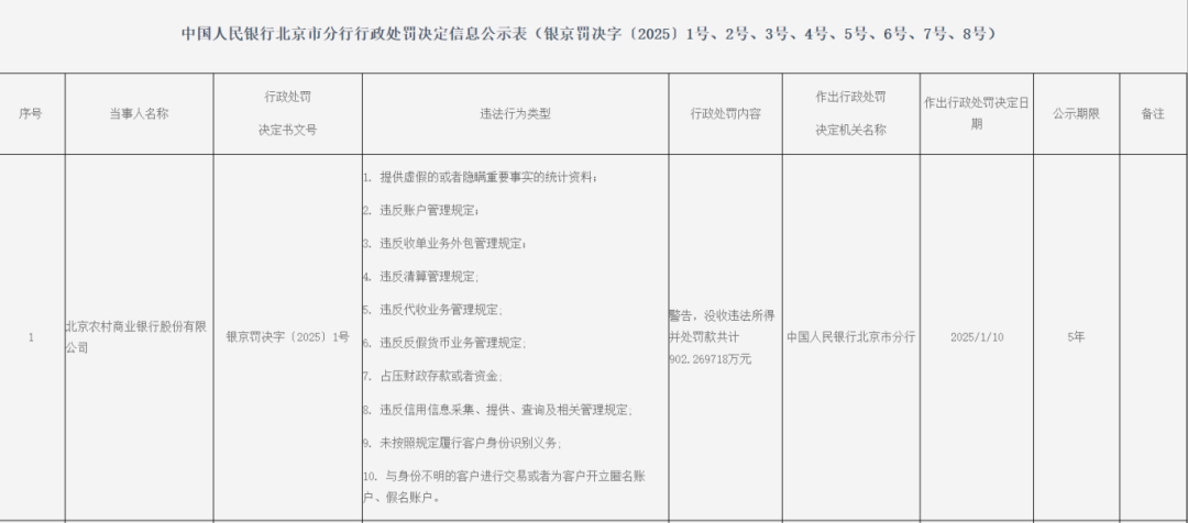2025 年 1 月,因统计资料不实、账户管理违规等多项问题,被央行北京市分行罚没合计 902.27 万元